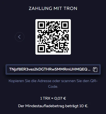Daher empfehlen wir Tron (TRX) für Casino Einzahlungen. Bei Tron dauert eine Transaktion weniger als eine Minute und kostet nur wenige Cent Gebühren. Jedoch ist Tron nicht so Wertstabil wie Bitcoin, hier müssen Sie entscheiden auf welche Eigenschaft sie mehr Wert legen. Auch der Klassiker Litecoin (LTC) wäre eine Alternative, allerdings kann eine Transaktion bei Litecoin bis zu 5 Minuten dauern.